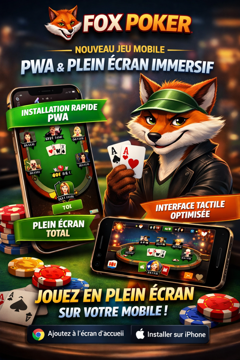 Le poker en ligne évolue rapidement, et Fox Poker franchit une nouvelle étape avec une expérience mobile totalement repensée. Grâce à l’intégration d’une Progressive Web App (PWA) et d’un mode plein écran optimisé, jouer au poker sur smartphone devient aussi fluide qu’une application native.